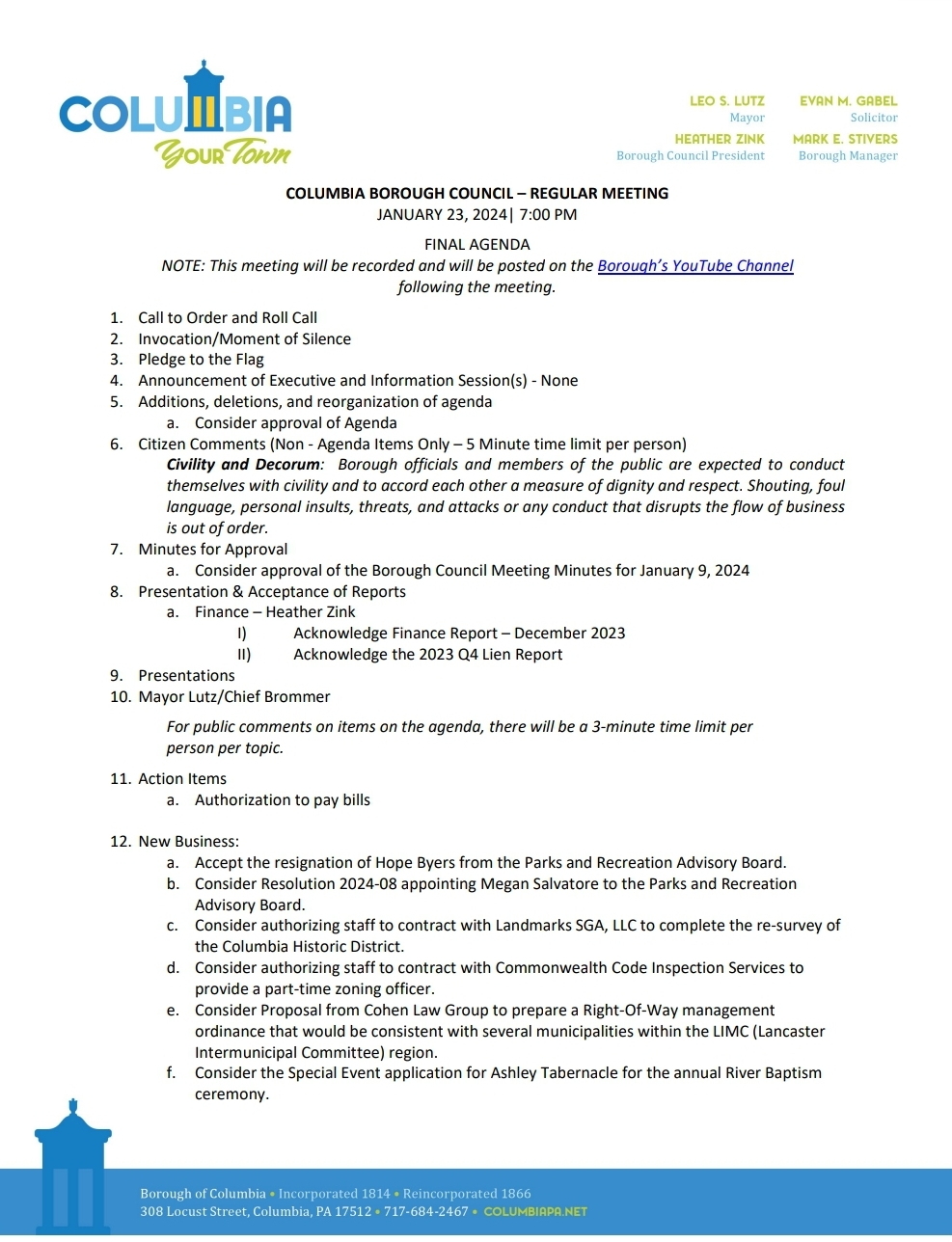 Agenda - Columbia Borough Council Meeting - January 23, 2024